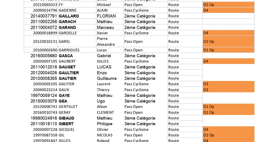 Ci-dessous la liste des catégories imposées par ordre alphabétique pour la saison 2022 établie selon les critères de la commission nationale route.