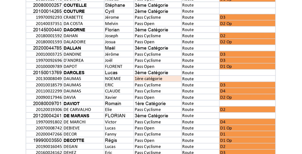 - Femmes : 80 premières issues de Cicle WEB sur une période allant du 31/08/2020 au 18/10/2021 – Minuit (avec juniors 1ère année de 2004 et quelques cadettes retirées) avec en jaune les filles appartenant aux équipes UCI. Les 1ères catégories imposées sont les 80 premières françaises + les filles appartenant à des équipes UCI classées.